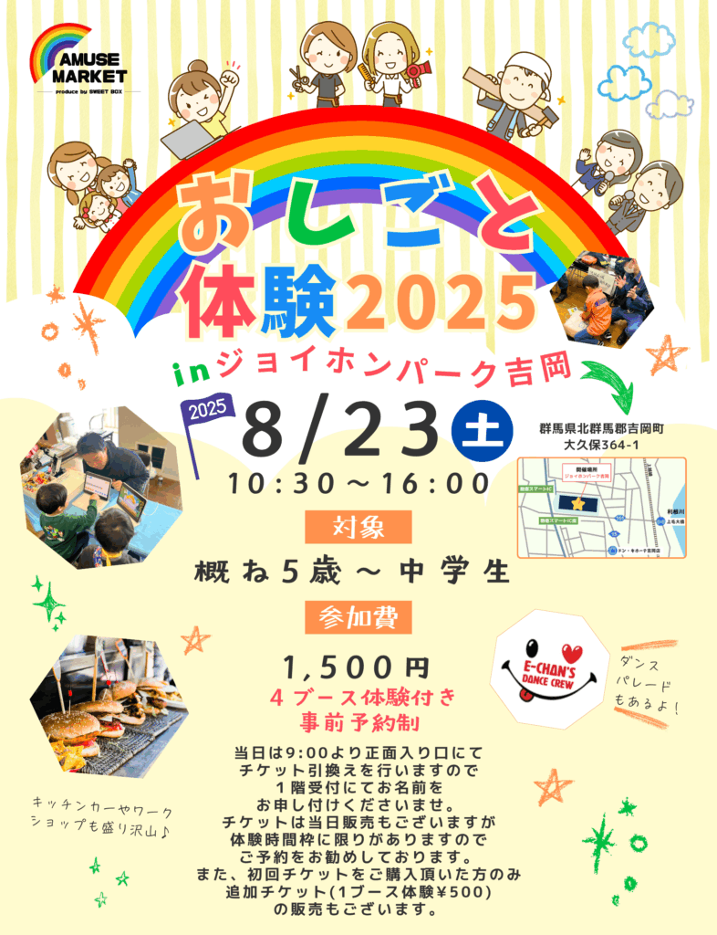 ※初回チケットをご購入いただいた方に限り、追加チケット(1ブース体験:500円)の販売がございます。